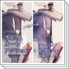 "It is a auto action that can process simple fill layers in a watercolor style, and a set of tools that seem useful to use together. It is border of watercolor on the border with the transparent, but there is a slight paleness on the inside, and the overall paint is uneven."